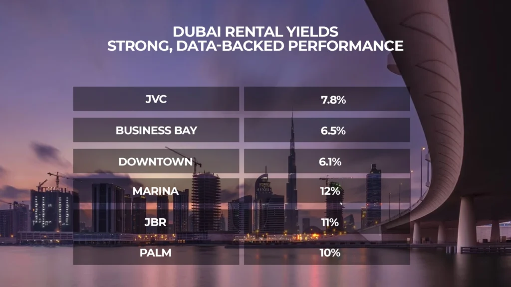 • Long-Term Rentals: JVC: 7.8% / Business Bay: 6.5% / Downtown Dubai: 6.1%
